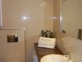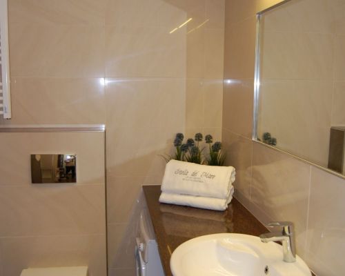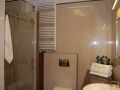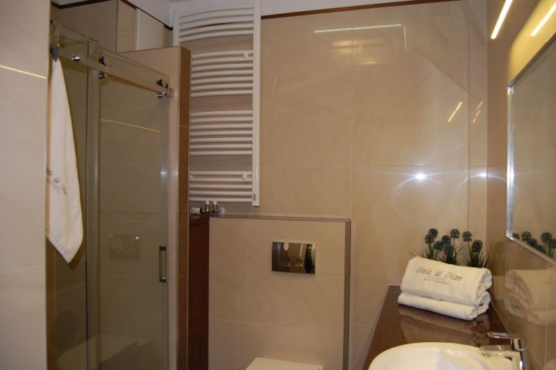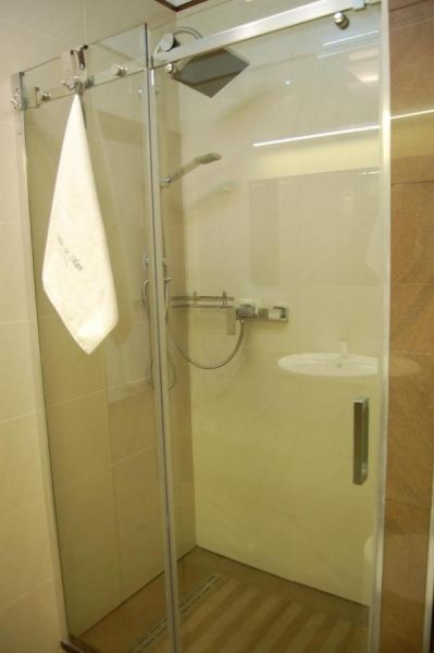 Kabina prysznicowa z deszczownicą, umywalką i dużym lustrem, wyposażona w: pralkę, deskę do prasowania, żelazko, suszarkę do prania, suszarkę do włosów, ręczniki, odkurzacz.