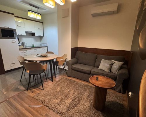 Ten przestronny apartament jest w pełni wyposażony, przeznaczony dla 4osób. Składa się z salonu z aneksem kuchennym i częścią jadalnianą oraz 1 sypialnią, łazienką, przedpokojem i umeblowanym tarasem. Posiada własne miejsce parkingowe w garażu podziemnym z bramą zamykaną na pilot. Goście mają do dyspozycji bezpłatne WiFi.