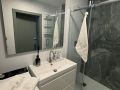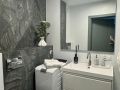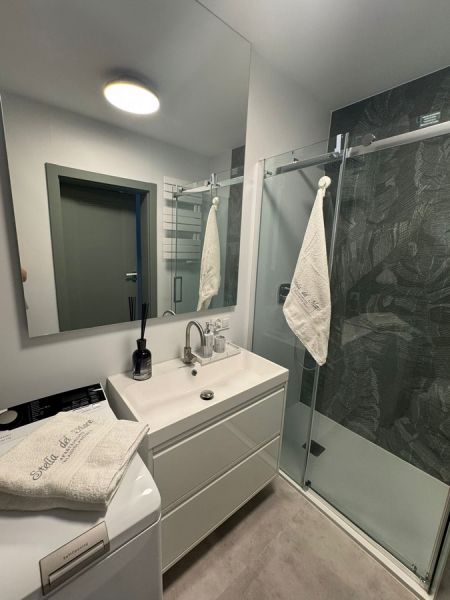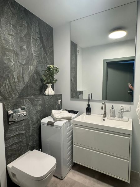 Kabina prysznicowa, umywalka z lustrem, pralka, deska do prasowania, żelazko, suszarka do prania, suszarka do włosów, ręczniki, odkurzacz.