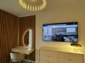 Łózko hotelowe małżeńskie z możliwością rozsunięcia, 2 szafki z lampką nocną, TV LED smart.